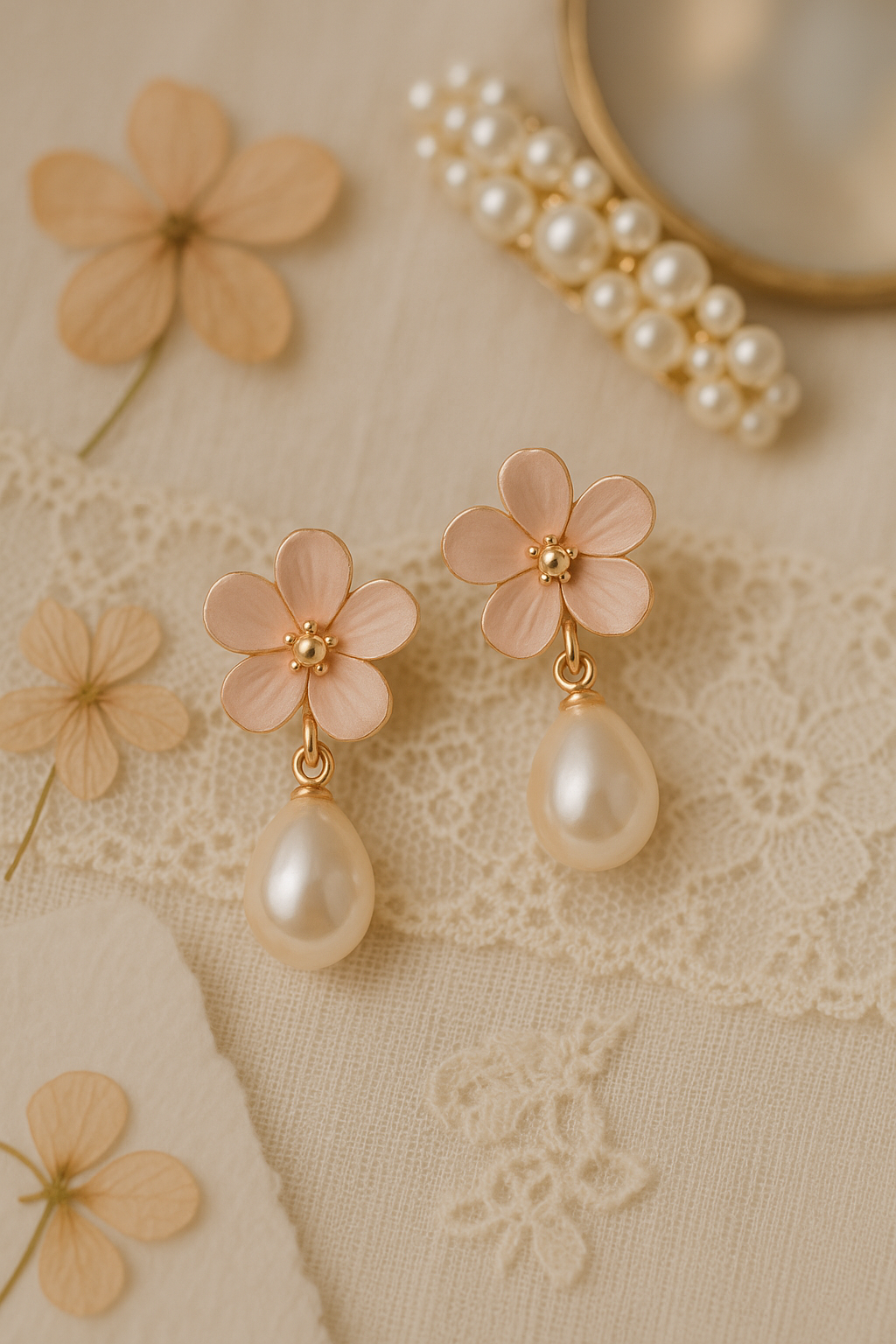 Blush-toned floral studs with pearl drops, designed to bloom with every heartbeat. Romantic, feminine, and full of charm.